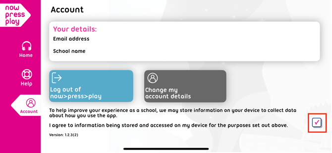 If you've already logged in before, you can review this setting at any time. Simply go to the Account section of the now>press>play App and ensure the data-sharing checkbox is ticked.